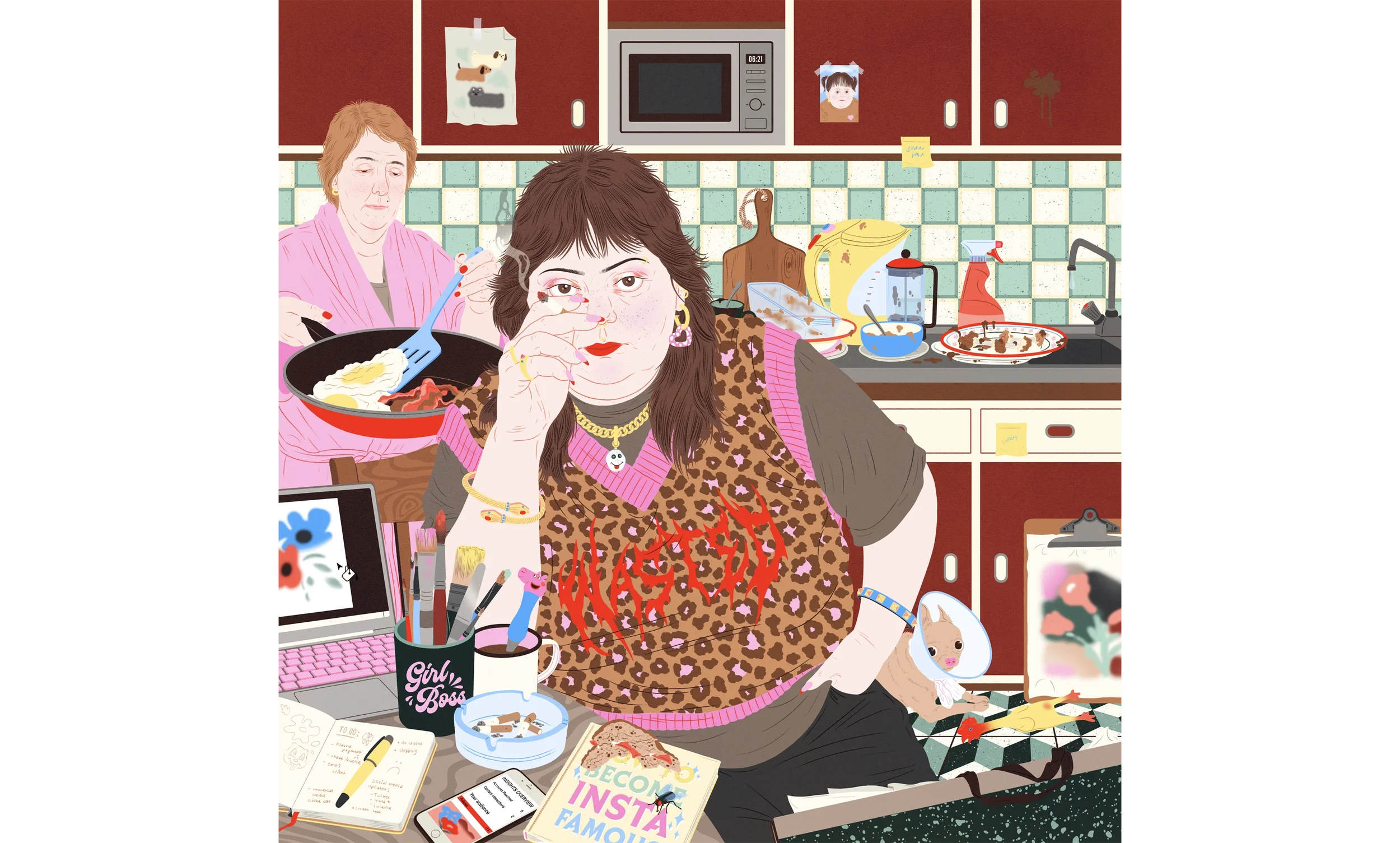 Originally an editorial commission exploring the trials and tribulations of being an artist on social media, All Nighter is a nod to those early-career illustrator days, marked by financial uncertainty, late nights of creative exploration, and the navigation of familiar bonds while searching for success and a personal artistic voice.