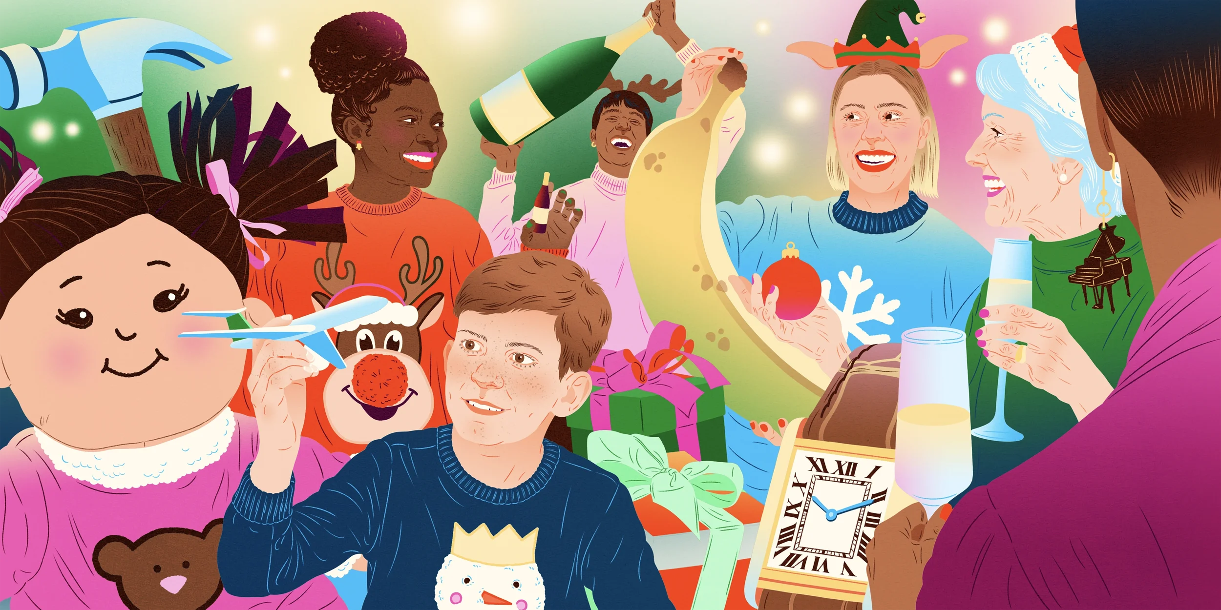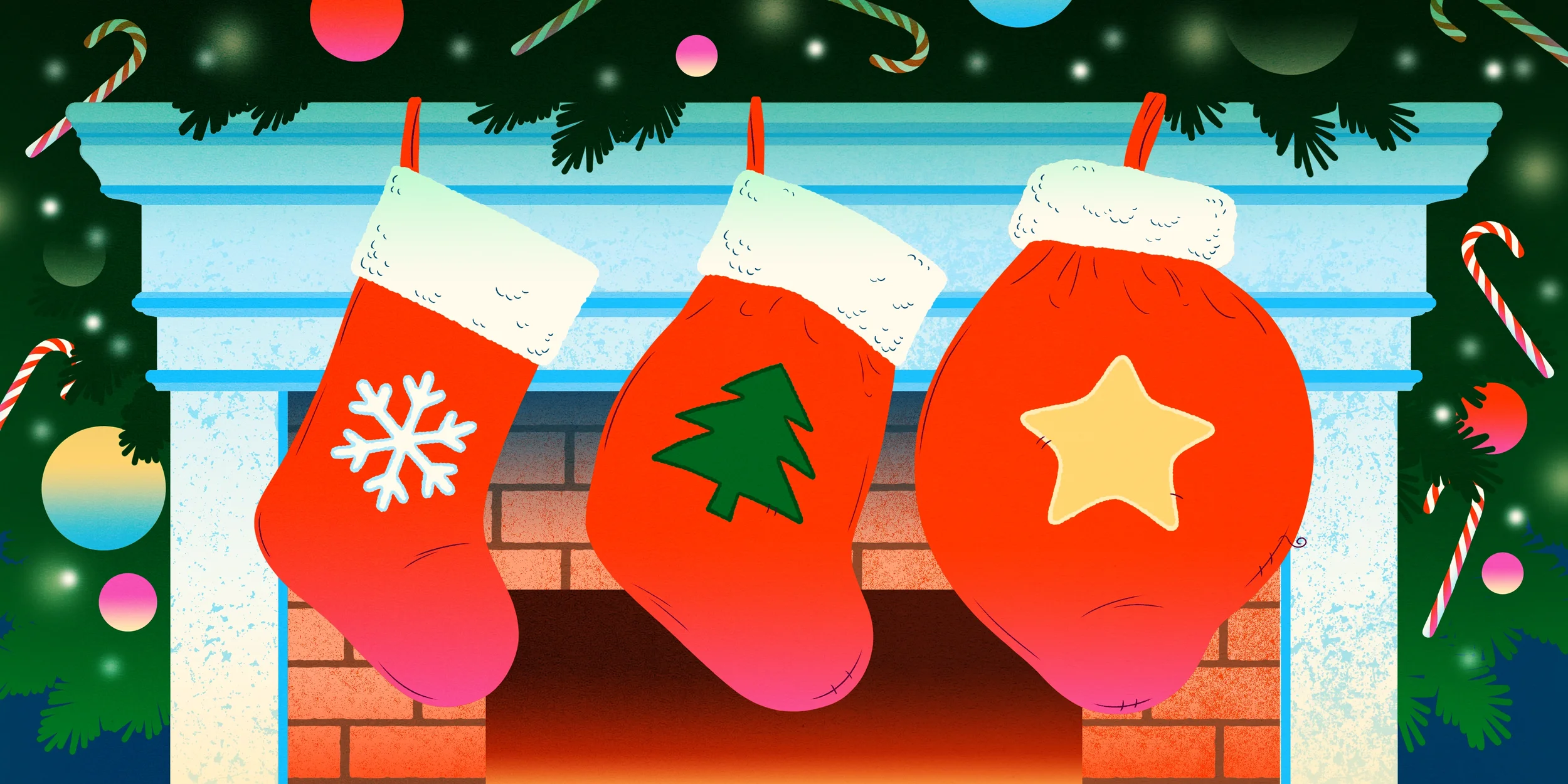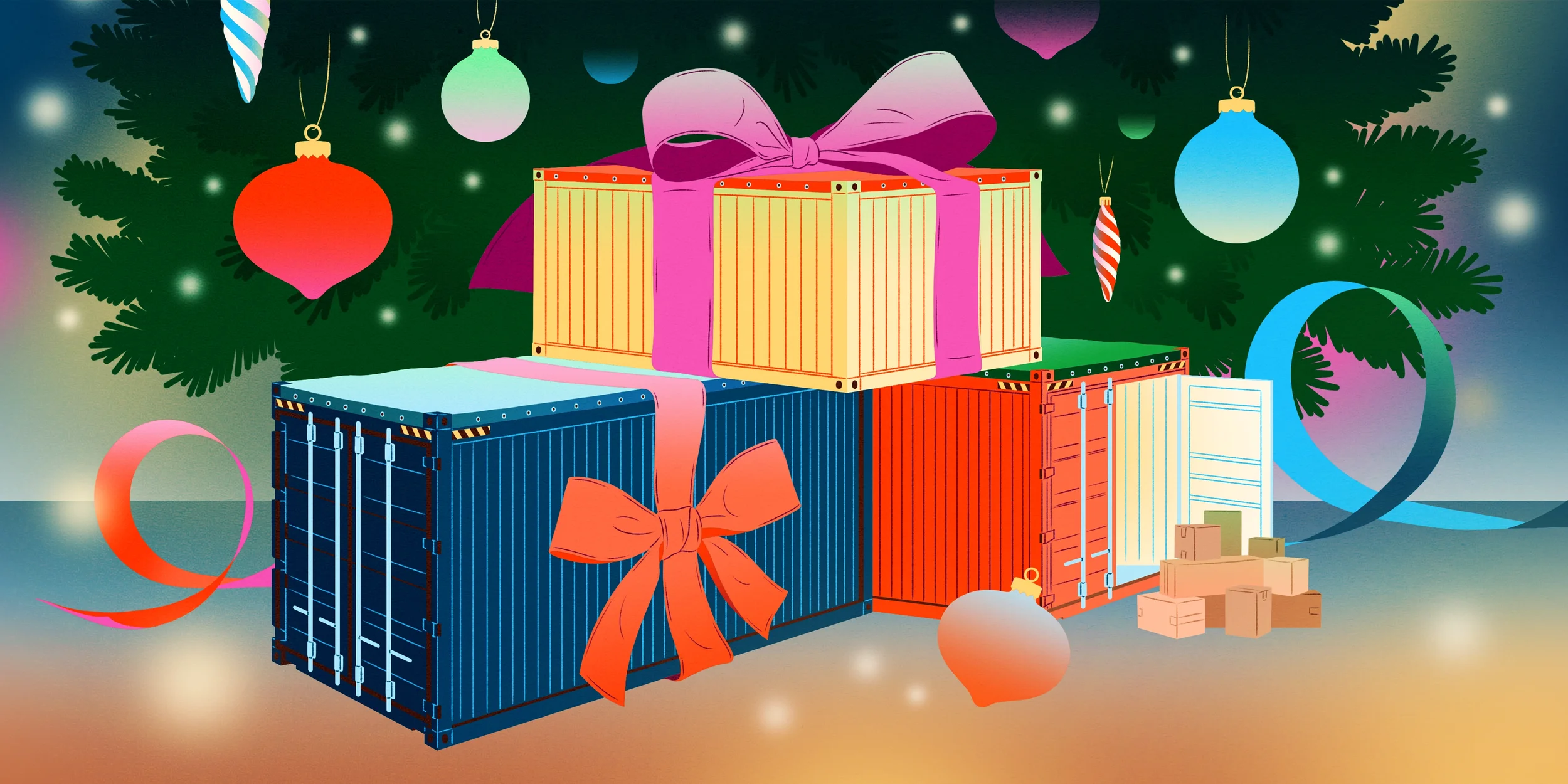 Editorial illustration for the Bloomberg article ‘Your 2025 Guide to Holiday Prices: Where Tariffs Are Biting and Where They’re Not.’ Commissioned to accompany coverage of Christmas shopping and inflation, the project comprises three illustrations that translate economic pressure into festive imagery: from oversized consumer goods signalling inflated prices, to bursting Christmas stockings and gift-wrapped shipping containers beneath the tree.