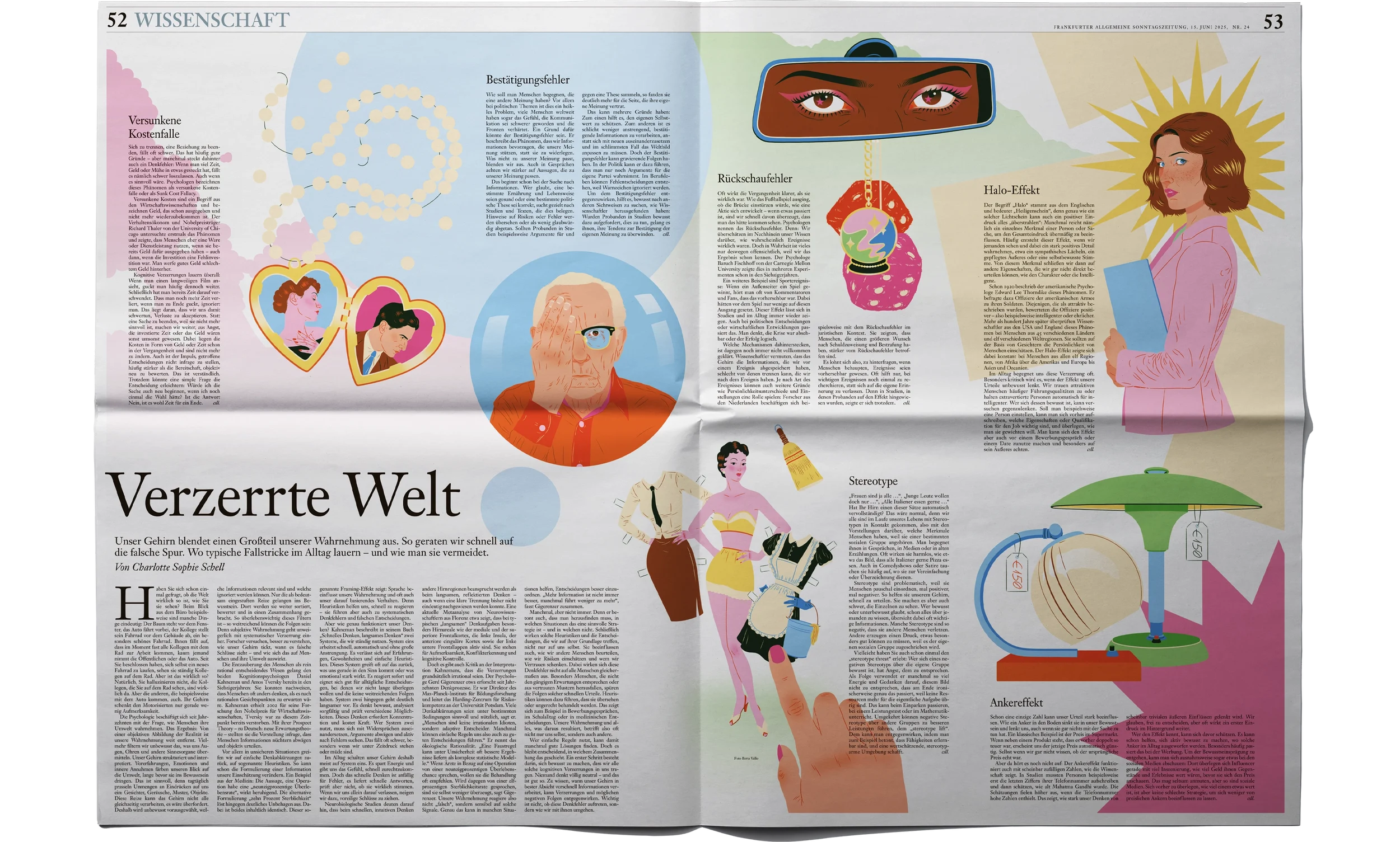 Editorial illustration for the Frankfurter Allgemeine Zeitung article ‘Distorted World’. This assignment visualises six cognitive biases: stereotypes, hindsight bias, the halo effect, sunk cost fallacy, anchoring effect, and confirmation bias—highlighting the typical pitfalls of everyday life and offering insight into how to recognise and avoid them.
