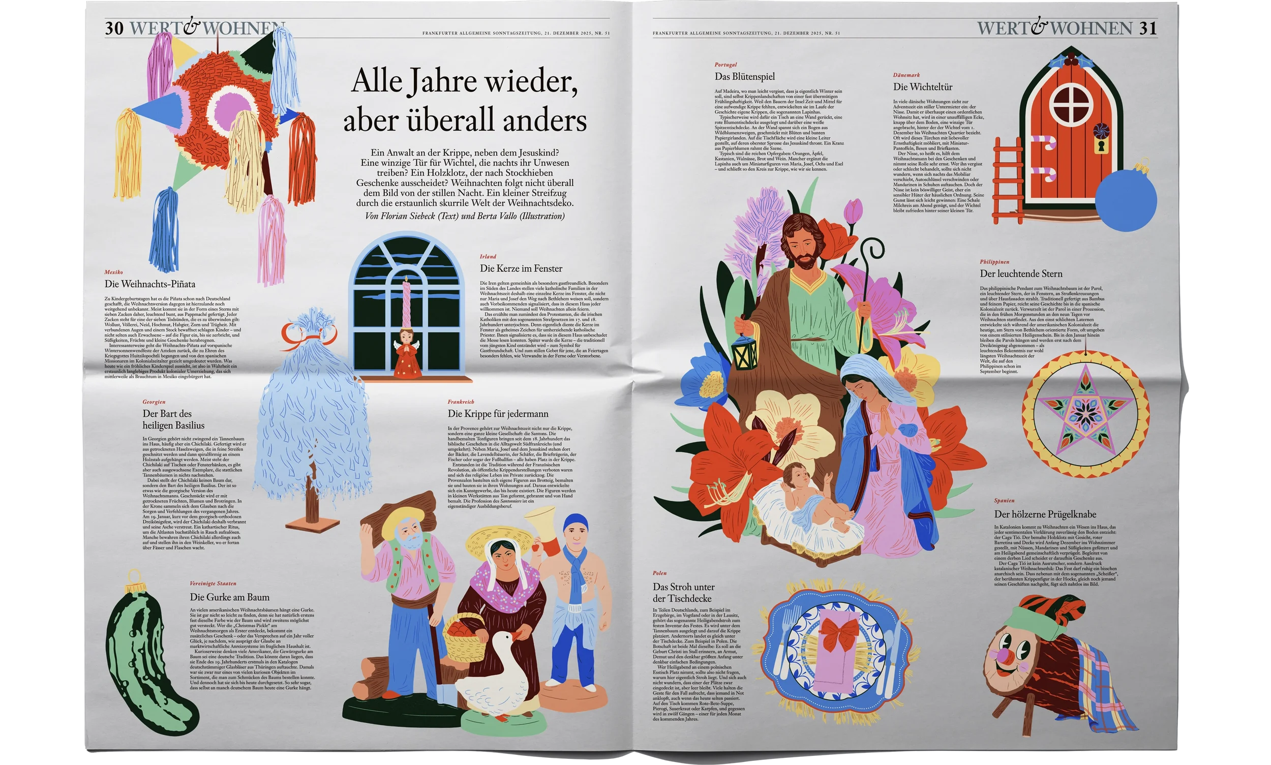 Editorial illustration for the Frankfurter Allgemeine Zeitung article ‘Every Year It’s the Same, but Everywhere It’s Different,’ examining Christmas traditions from around the globe. Commissioned as a series of illustrations for a double-page spread, the project highlights the unique holiday customs of ten countries.