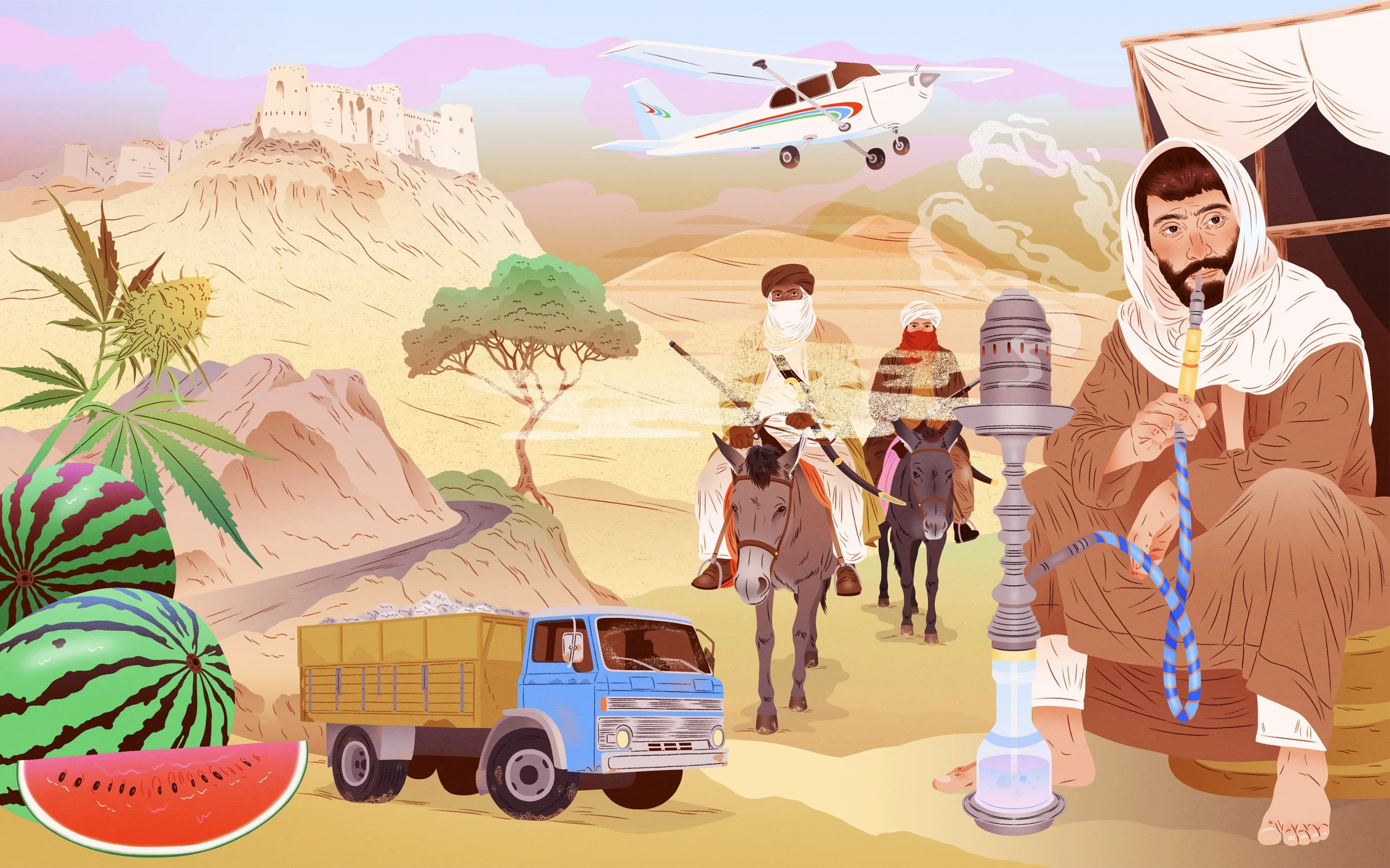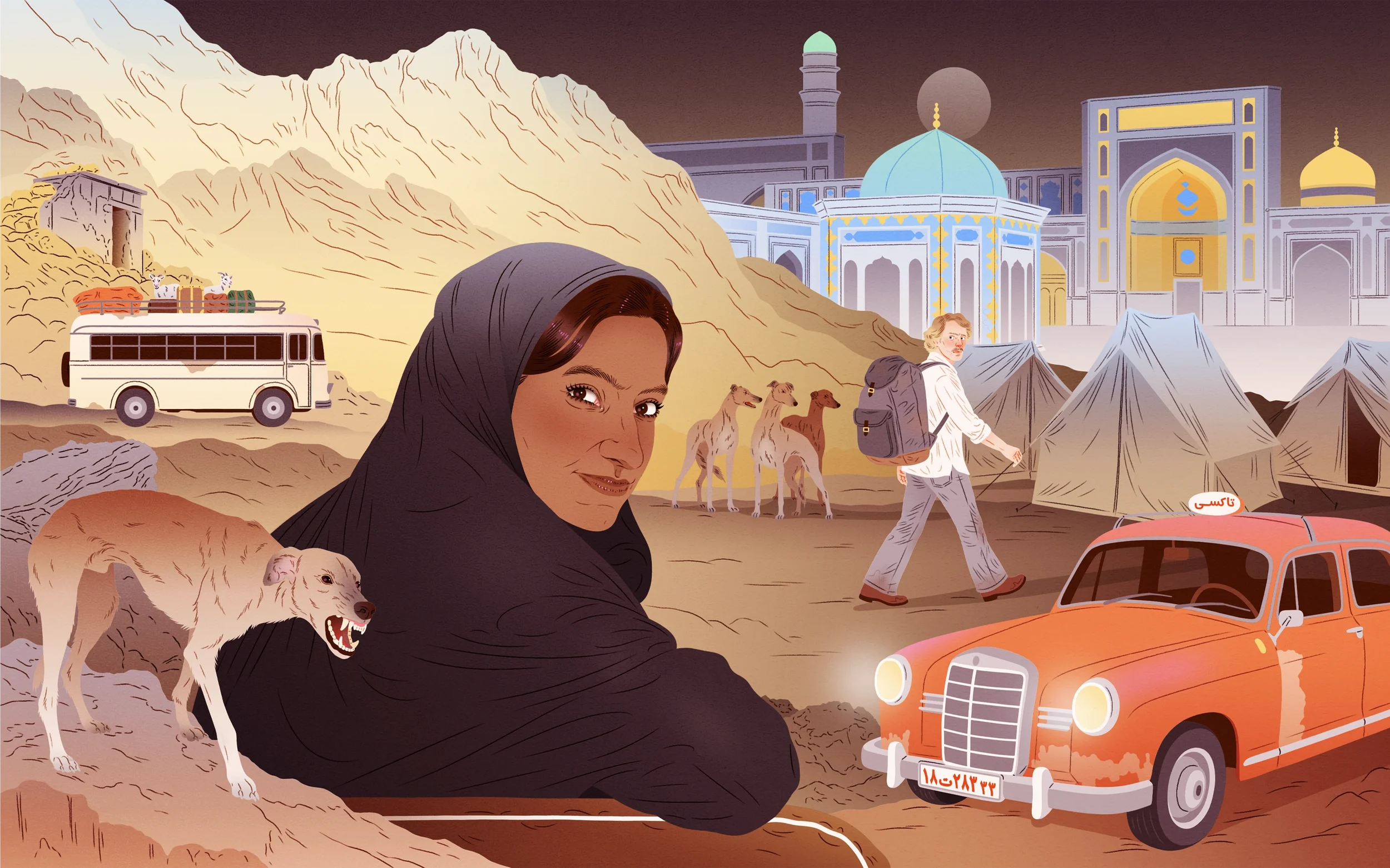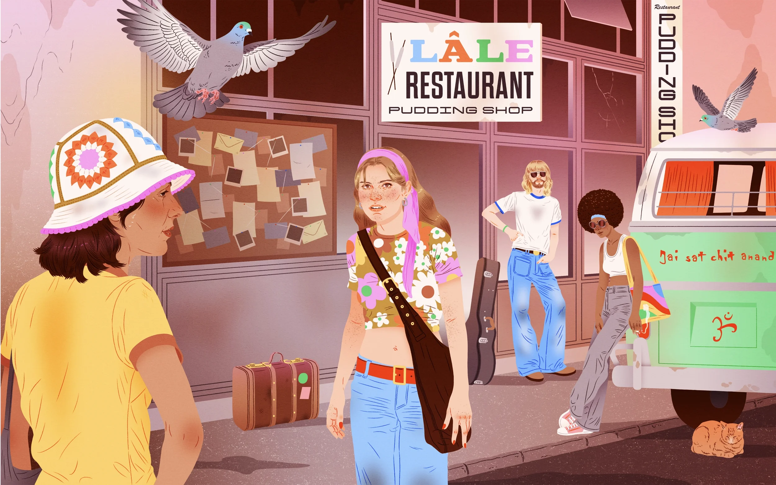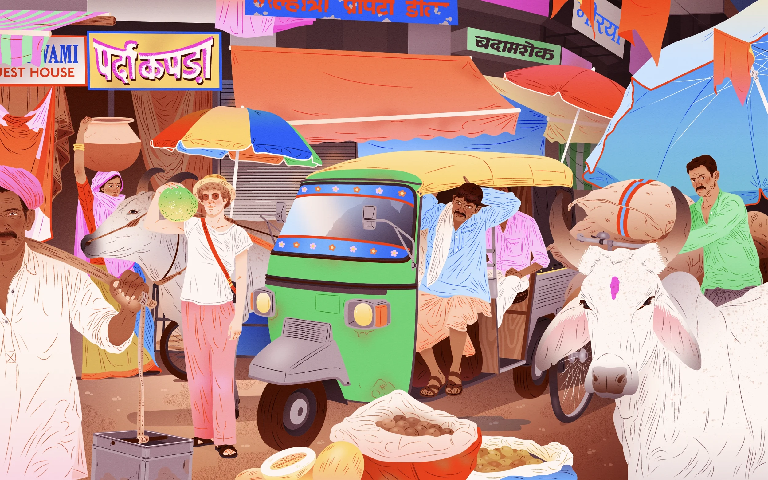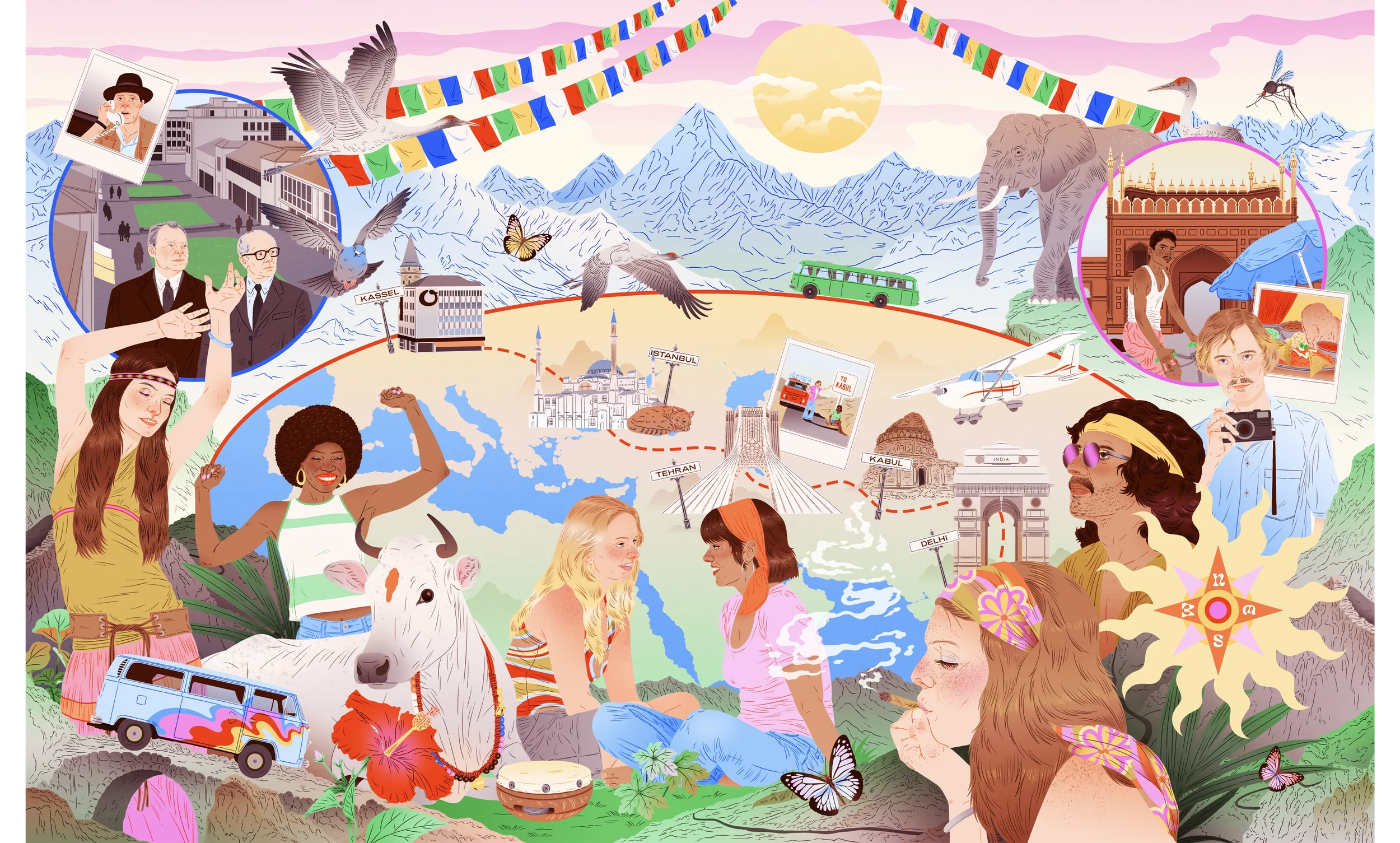 My Hippie Trail is a comprehensive online archive of stories and photographs tracing the journey along the iconic hippie trail from 1970s Kassel, Germany to Delhi, India. The brief was to create an illustrated map highlighting the journey’s key anchor points and modes of transport, bridging the two ends of the route while evoking a sense of freedom and adventure. The project also included four accompanying illustrations, conjuring memories of 1970s Istanbul’s iconic Pudding Shop, an unforgettable bus ride through Mashhad, watermelons in Herat, and the daily hustle and bustle of Delhi, our final stop.