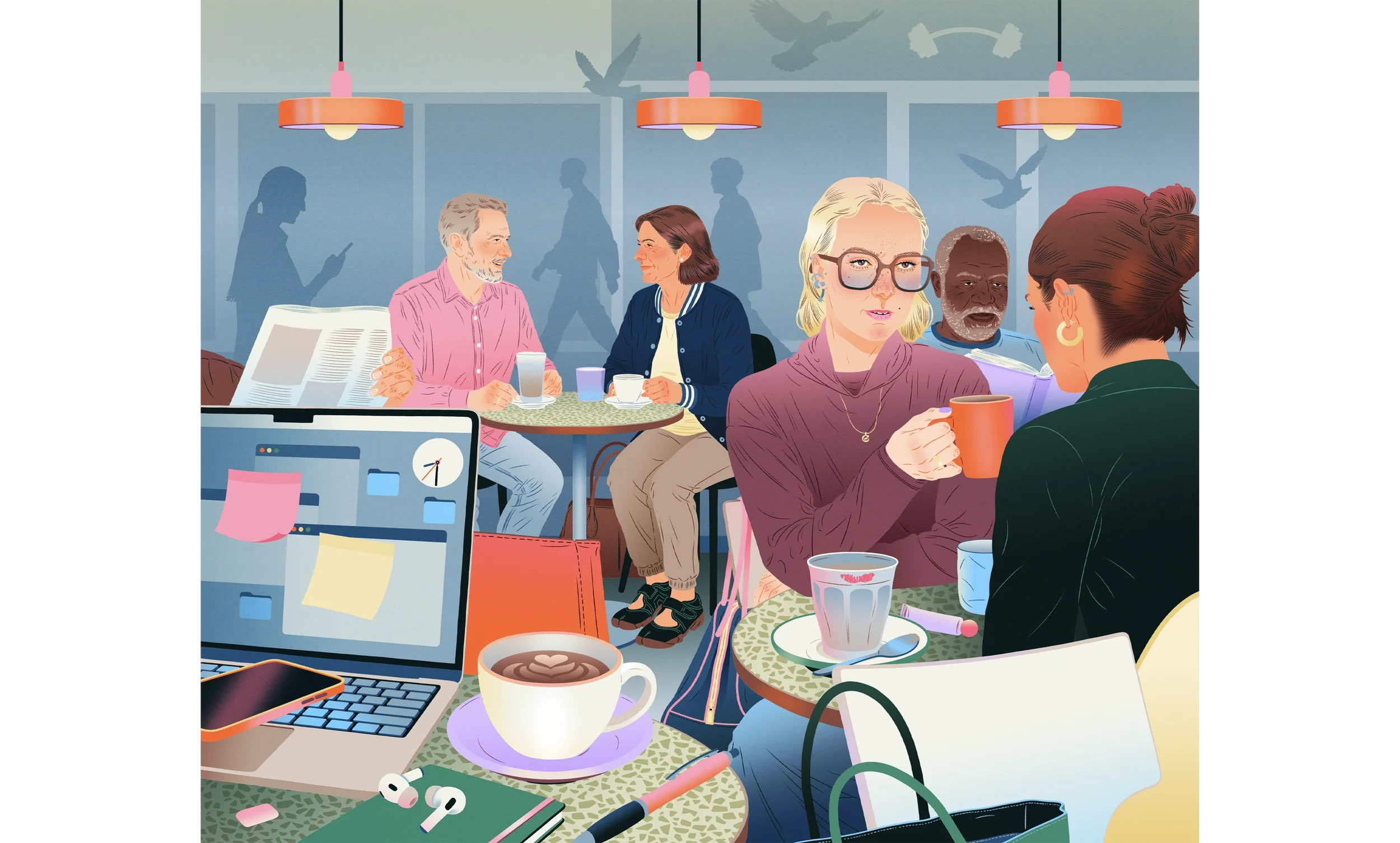 Editorial illustration for the ZEIT Online article ‘Why do you all have the day off?’, investigating the mystery of packed cafés and gyms on regular weekdays. It’s 9:30 a.m. in Germany: the cafés are full, the fitness classes fully booked, on completely ordinary Thursday morning. The piece was commissioned to illustrate a lively scene featuring specific characters mentioned throughout the article.